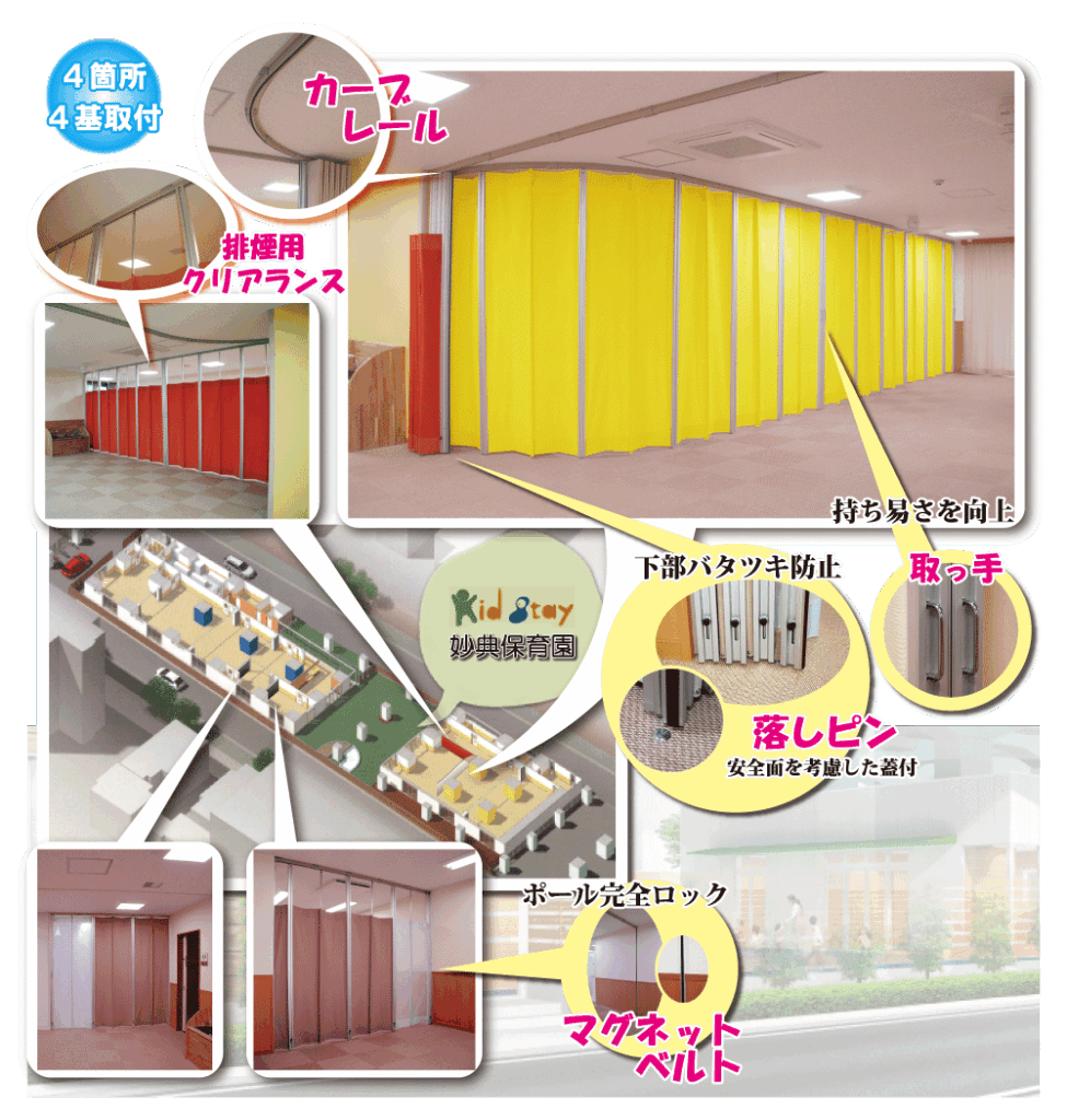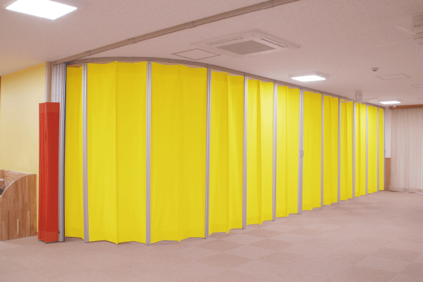 今までにいくつもの施設を開業されてきたオーナー様が、子供たちに優しい雰囲気を持つカーテンシャッター「アペリア」を選んでくださいました。4か所・計4基を導入していただきました。