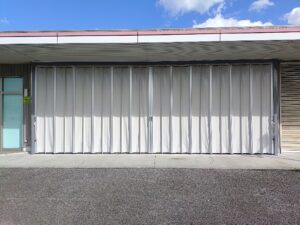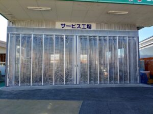 大空間の間仕切りに最適且つ、メイン通りに位置していて、たくさんの人に見られるところに位置する弊社には、デザイン性が高いカーテンシャッター「アペリア」がとても役立っています。