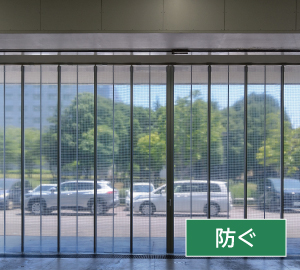 カーテンシャッター「アペリア」は、通過する人や物に合わせて必要なスペースだけ開口できるので、開閉時に自動で全開口になるシートシャッターに比べて、室内や作業場内の空調効果(冷気や暖気)を逃しにくく、エネルギー消費の削減に効果的です。ビニールカーテンは、カーテン下部が固定されていない簡易な作りのため、屋外への出入口付近の設置では空調管理や省エネ効果はあまり期待できません。