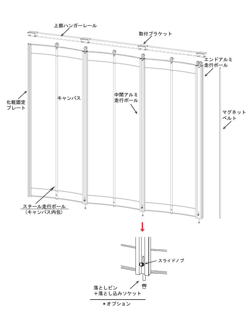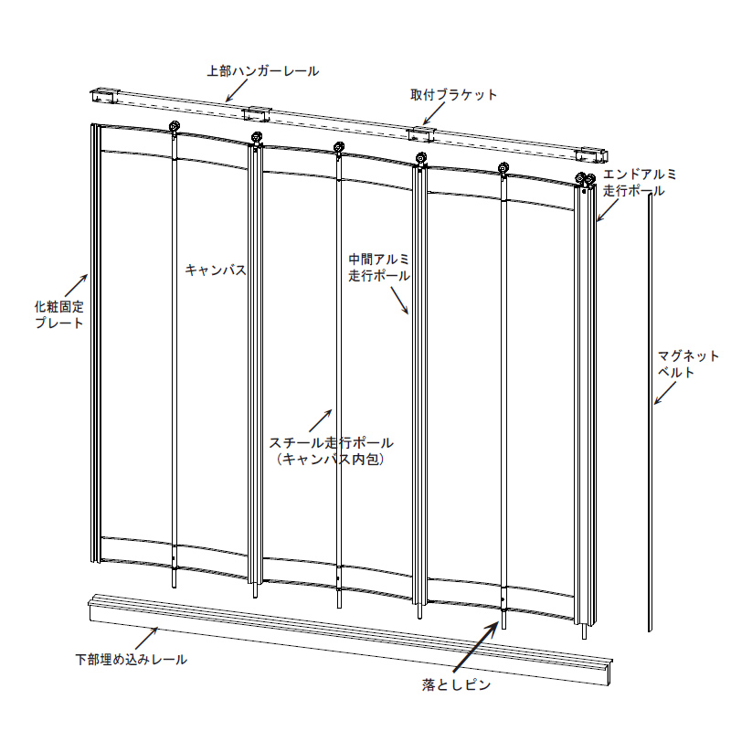 ・カーブレール仕様の場合、本体をまとめた状態での開閉操作はレール等に負荷がかかりますので、